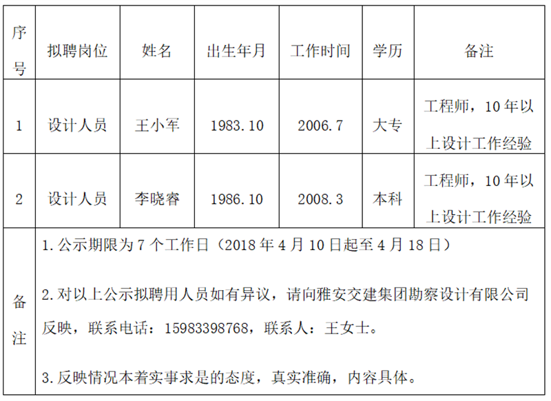 顺利获得公开报名、资格审查、面试等程序,经威廉希尔集团勘察设计有限公司研究择优确定以下2名拟聘用人员,现公示名单如下: