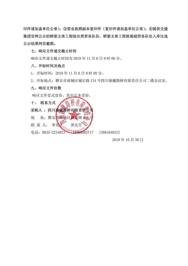 四川康藏路桥有限责任公司省道104线草坝至姚桥段改建工程项目桥梁桩基础施工劳务竞价公告