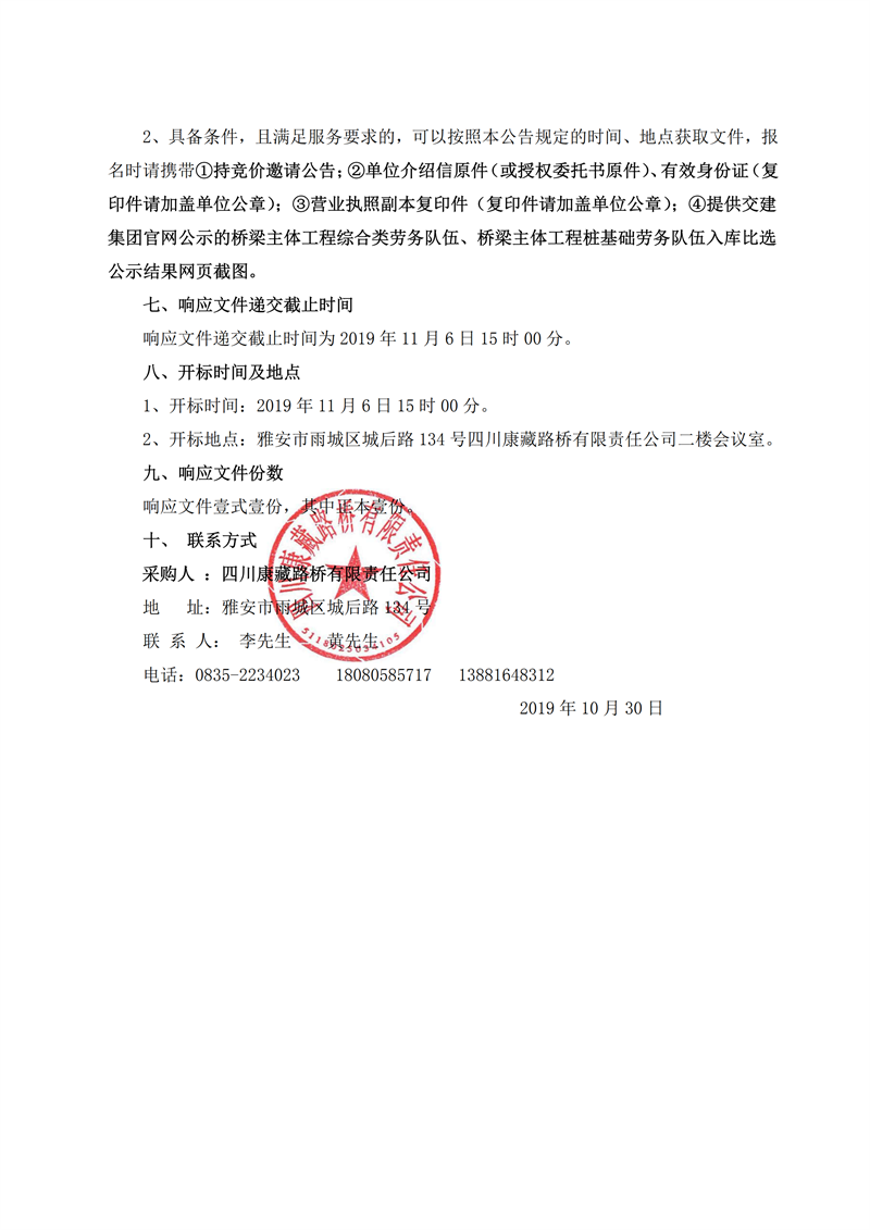 四川康藏路桥有限责任公司草坝青衣江大桥(茶地坎码头渡改桥)项目桥梁桩基础施工劳务竞价公告