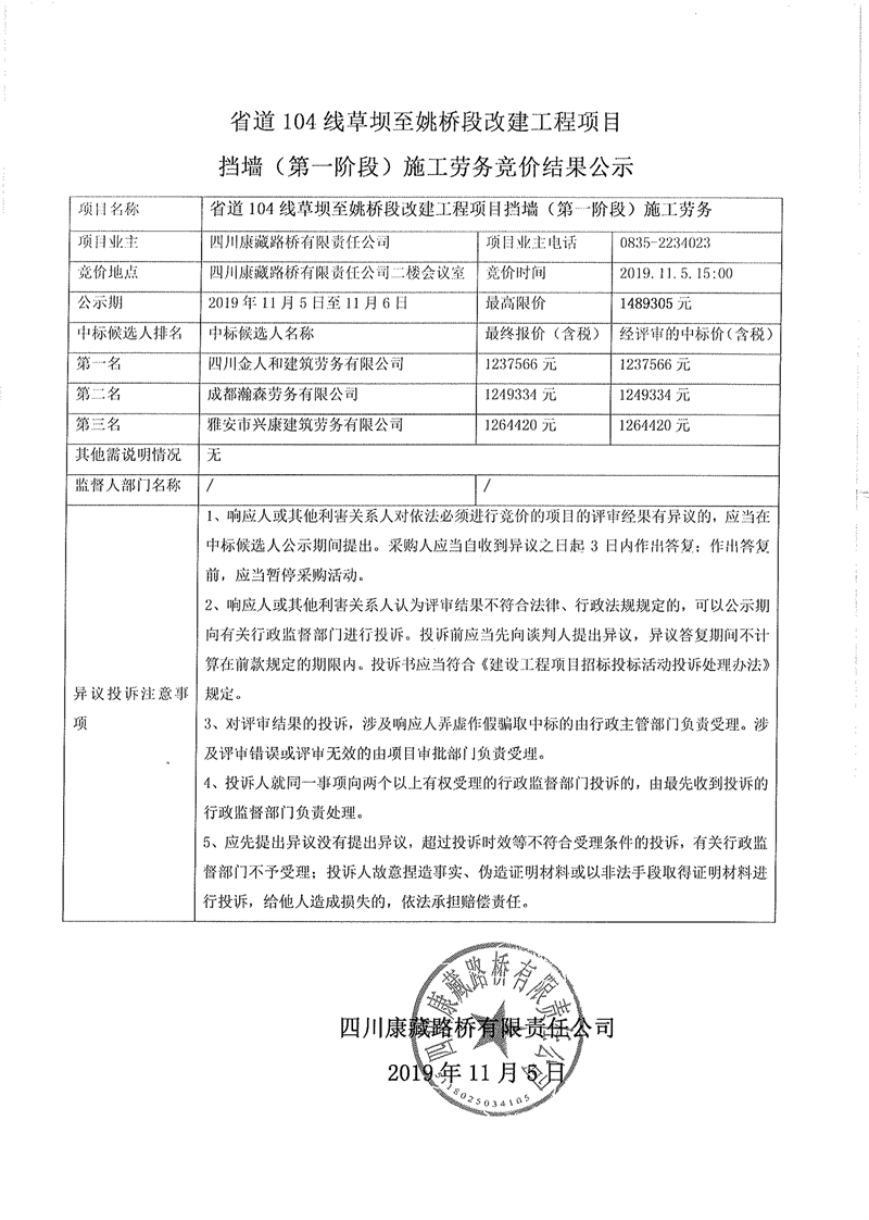 四川康藏路桥有限责任公司省道104线草坝至姚桥段改建工程项目挡墙(第一阶段)施工劳务竞价结果公示