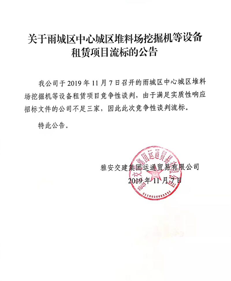 威廉希尔集团运通贸易有限公司关于雨城区中心城区堆料场挖掘机等设备租赁项目流标的公告