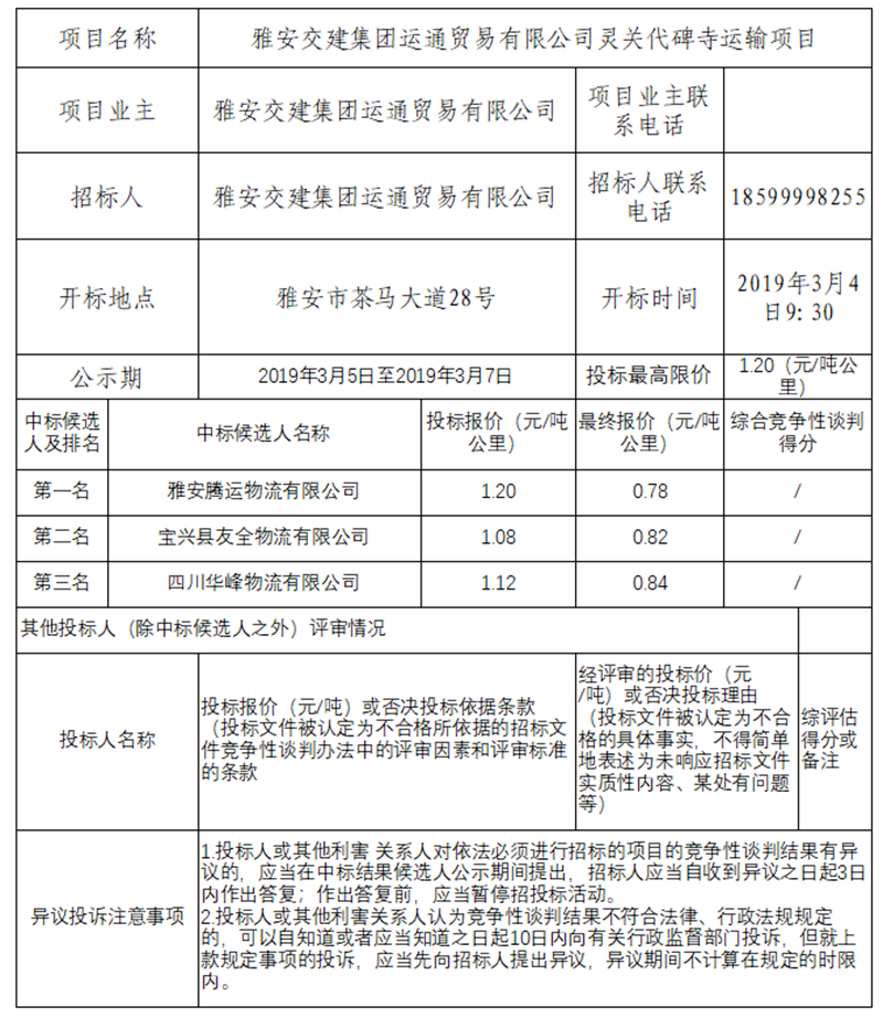 威廉希尔集团运通贸易有限公司灵关代碑寺运输项目竞争性谈判结果公示