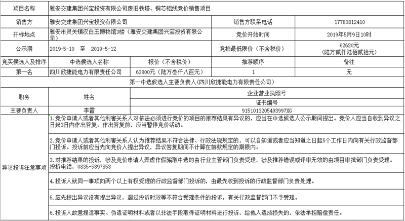 威廉希尔集团兴宝投资有限公司废旧铁塔、铜芯铝线竞价销售项目公示