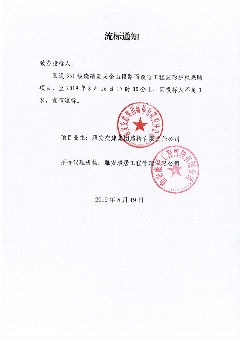 威廉希尔集团路桥有限责任公司国道351线硗碛至夹金山段路面改造工程波形护栏采购项目流标通知