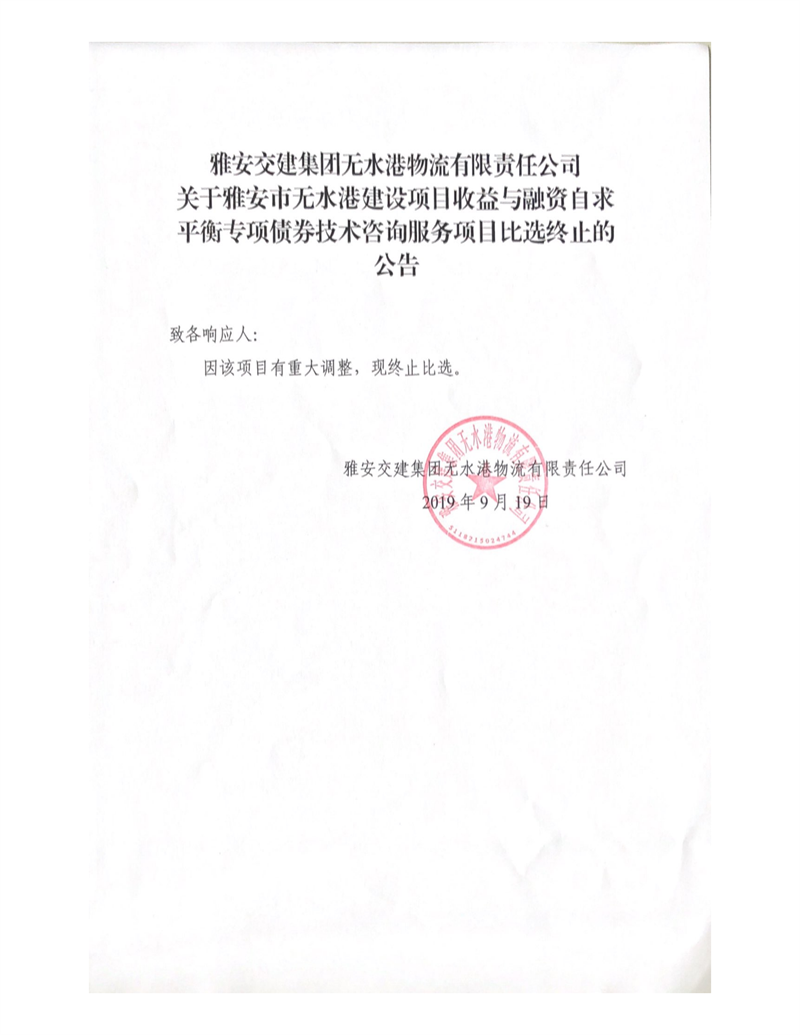 威廉希尔集团无水港物流有限责任公司关于雅安市无水港建设项目收益与融资自求平衡专项债券技术咨询服务项目比选终止的公告