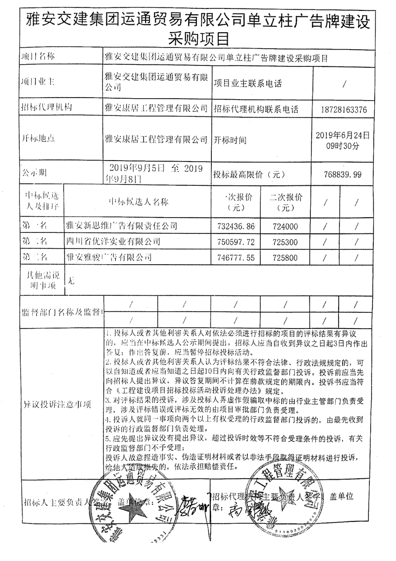 威廉希尔集团运通贸易有限公司单立柱广告牌建设采购项目竞争性谈判结果公示