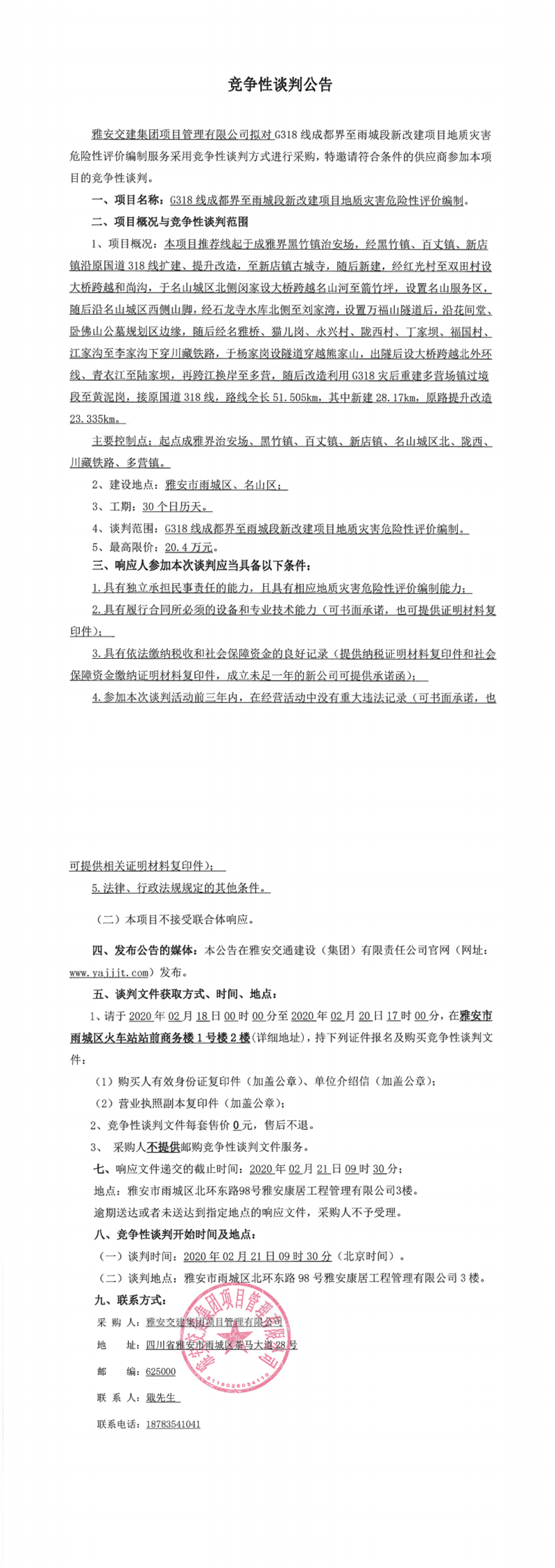 威廉希尔集团项目管理有限公司G318线成都界至雨城段新改建项目地质灾害危险性评价编制竞争性谈判公告
