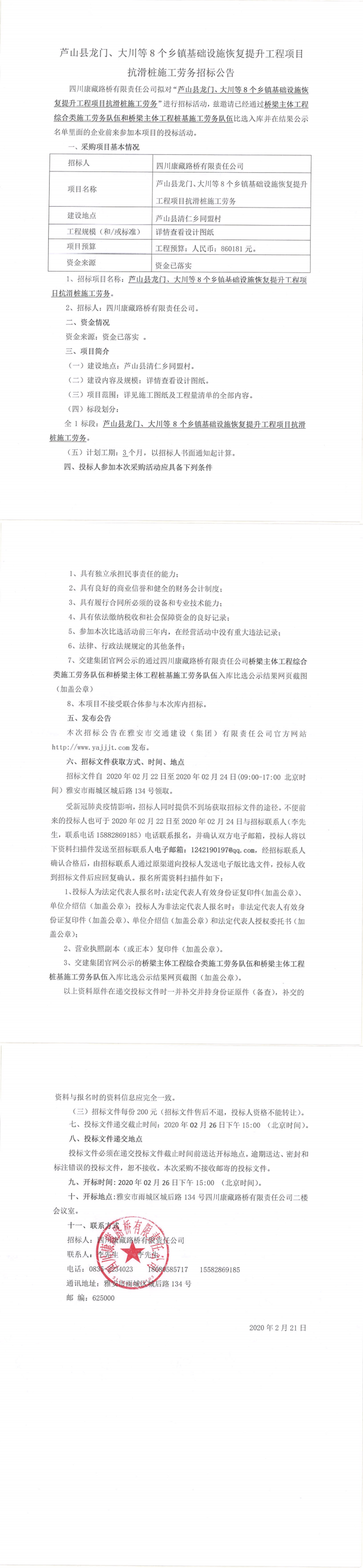四川康藏路桥有限责任公司芦山县龙门、大川等8个乡镇基础设施恢复提升工程项目抗滑桩施工劳务招标公告