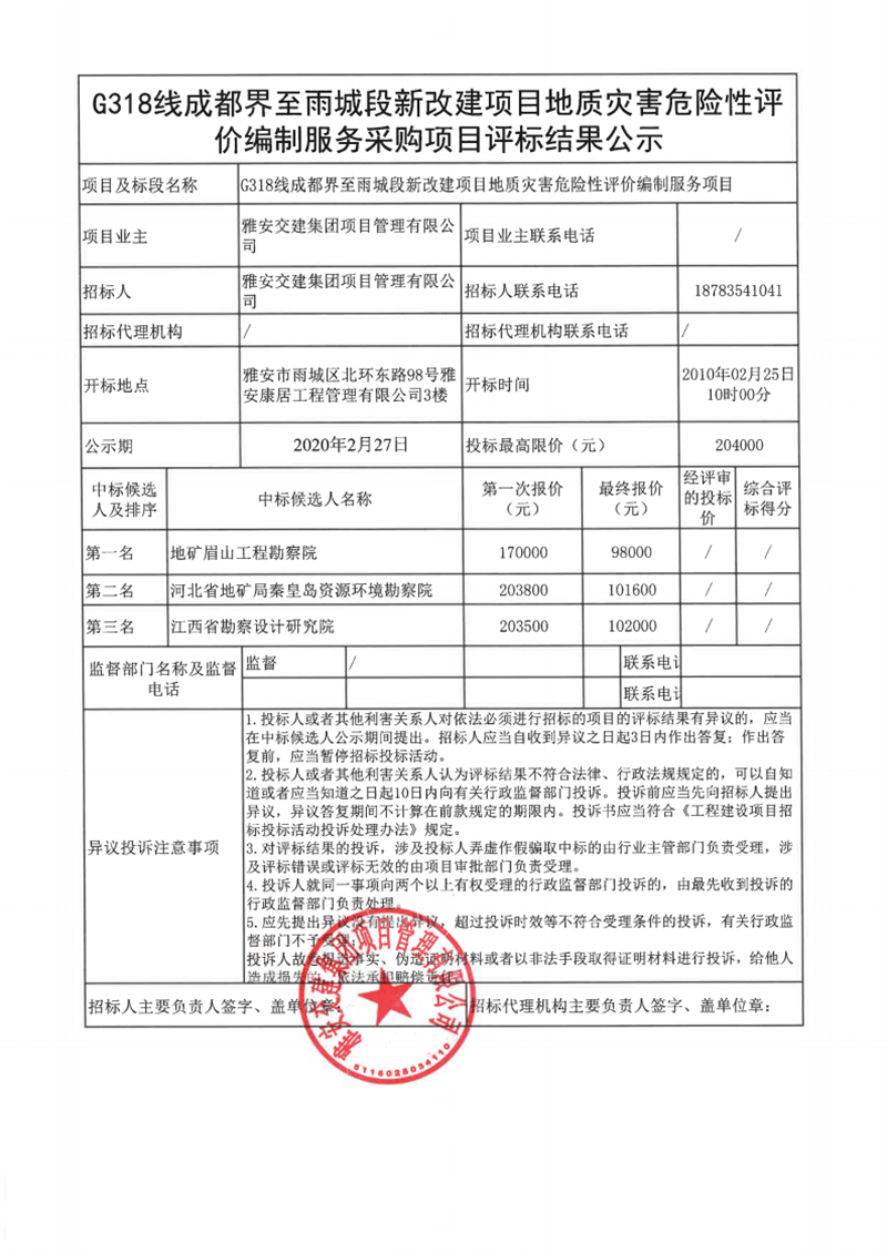 威廉希尔集团项目管理有限公司G318线成都界至雨城段新改建项目地质灾害危险性评价编制服务项目评标结果公示