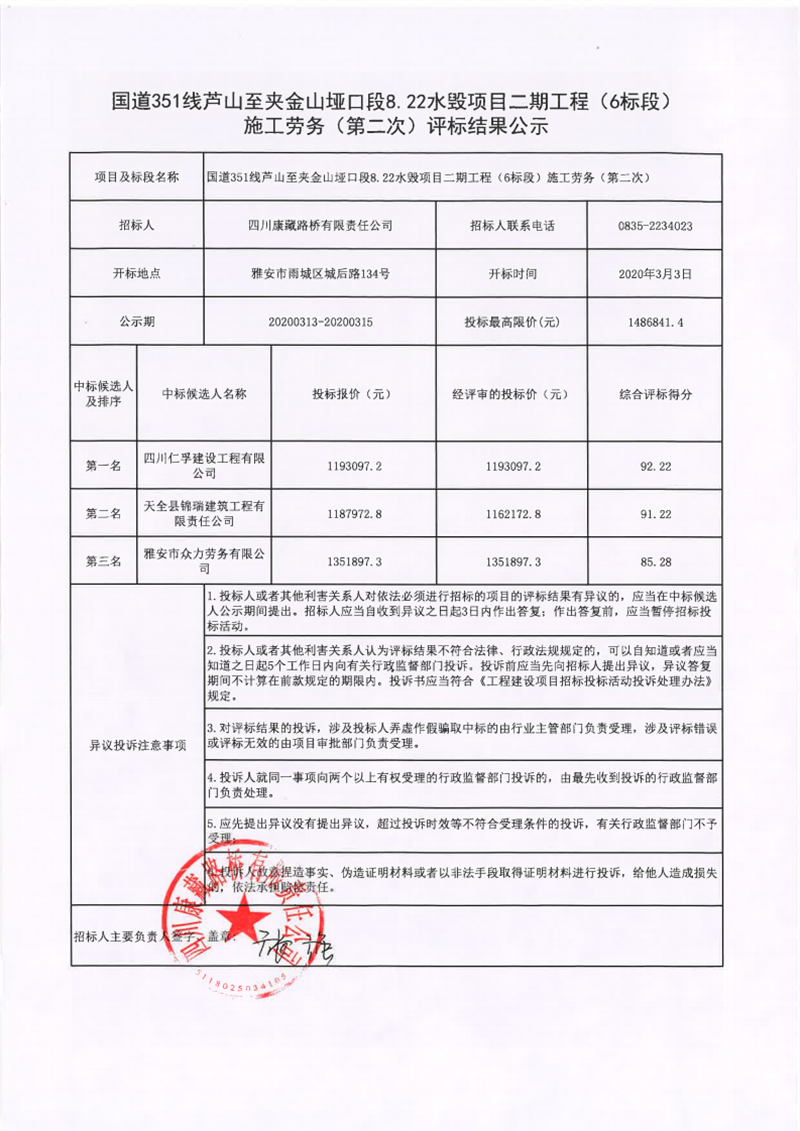 四川康藏路桥有限责任公司国道351线芦山至夹金山垭口段8.22水毁项目二期工程(6标段)施工劳务(第二次)评标结果公示