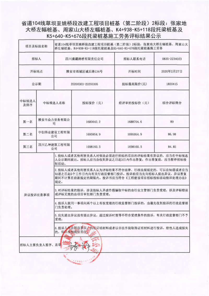 四川康藏路桥有限责任公司省道104线草坝至姚桥段改建工程项目桩基(第二阶段)2标段:张家地大桥左幅桩基、周家山大桥左幅桩基、K4+938-K5+118段托梁桩基及K5+640-K5+676段托梁桩基施工劳务评标结果公示