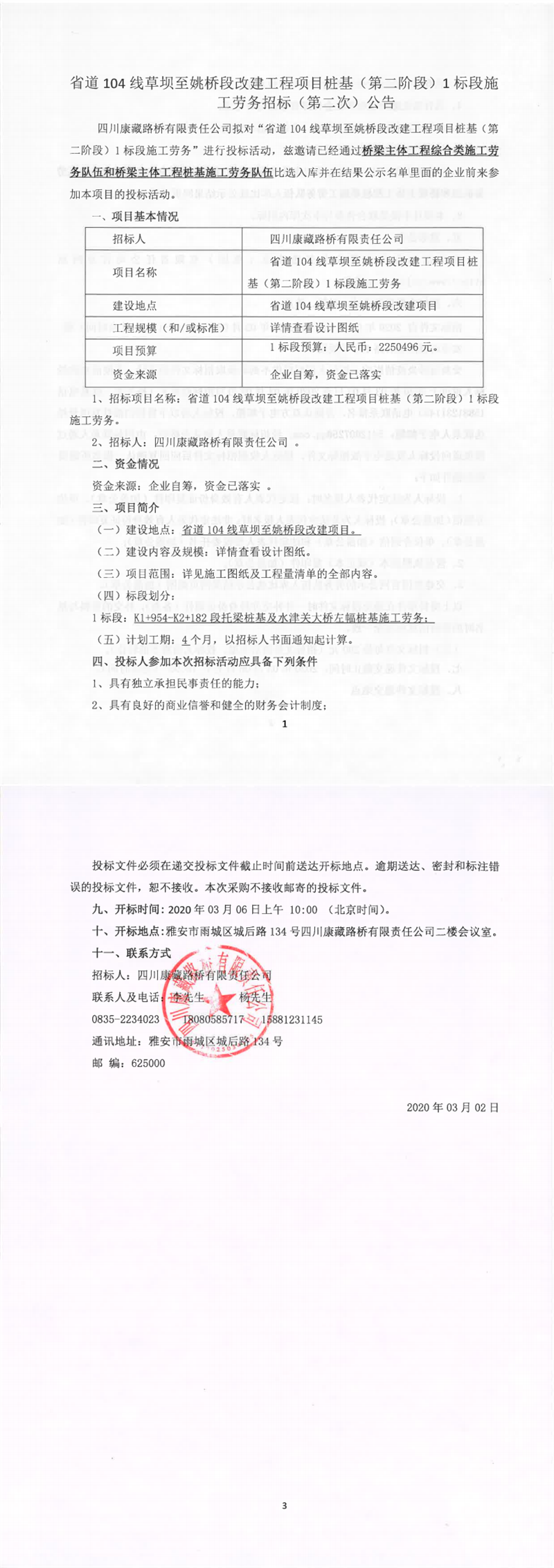 四川康藏路桥有限责任公司省道104线草坝至姚桥段改建工程项目桩基(第二阶段)1标段施工劳务招标(第二次)公告