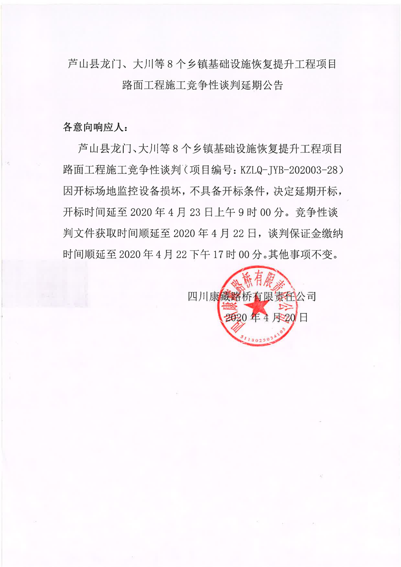 四川康藏路桥有限责任公司芦山县龙门、大川等8个乡镇基础设施恢复提升工程项目路面工程施工竞争性谈判延期公告
