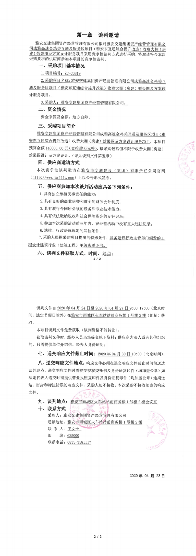 威廉希尔集团资产经营管理有限公司成雅高速金鸡关互通及服务区项目(雅安东互通综合提升改造)收费大棚(房建)效果图及方案设计服务项目竞争性谈判公告