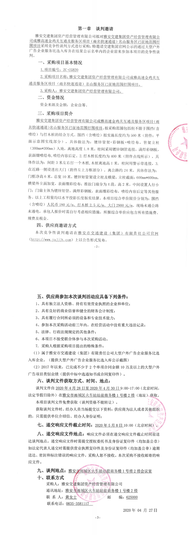 威廉希尔集团资产经营管理有限公司成雅高速金鸡关互通及服务区项目(雨名快速通道)名山服务区已征地范围打围项目竞争性谈判公告