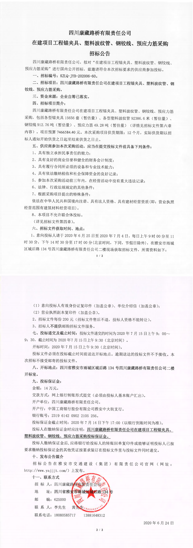 四川康藏路桥有限责任公司在建项目工程锚夹具、塑料波纹管、钢铰线、预应力筋采购招标公告