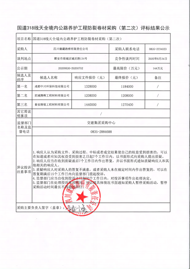 四川康藏路桥有限责任公司国道318线天全境内公路养护工程防裂卷材采购(第二次)评标结果公示