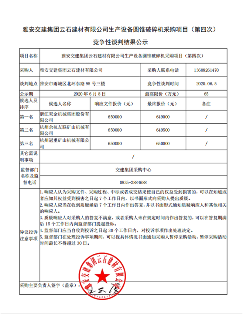 威廉希尔集团云石建材有限公司生产设备圆锥破碎机采购项目(第四次)竞争性谈判结果公示
