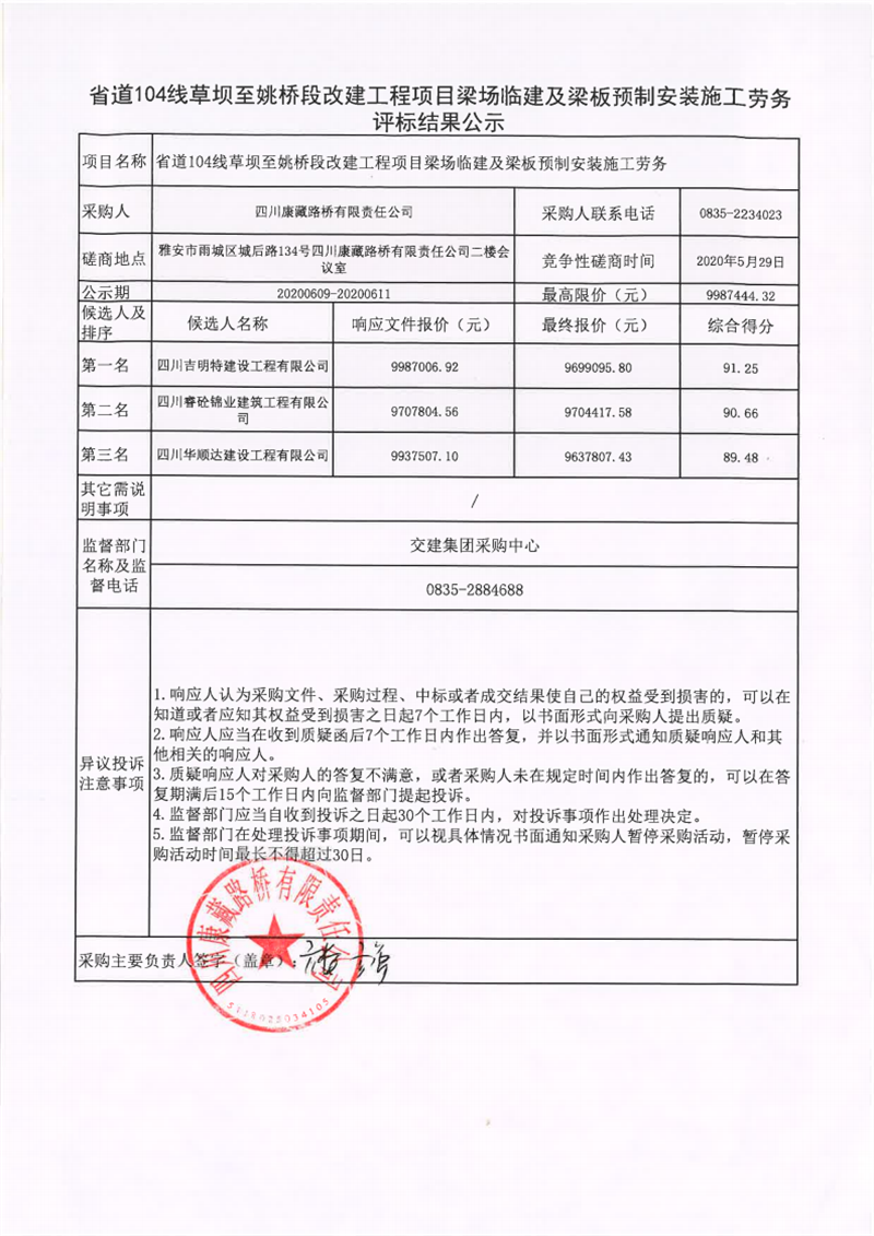 四川康藏路桥有限责任公司省道104线草坝至姚桥段改建工程项目梁场临建及梁板预制安装施工劳务评标结果公示