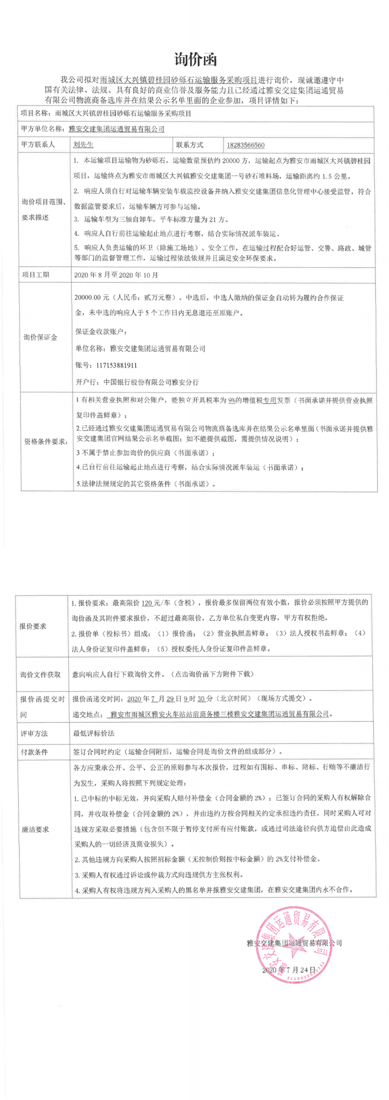 威廉希尔集团运通贸易有限公司雨城区大兴镇碧桂园砂砾石运输服务采购项目询价函
