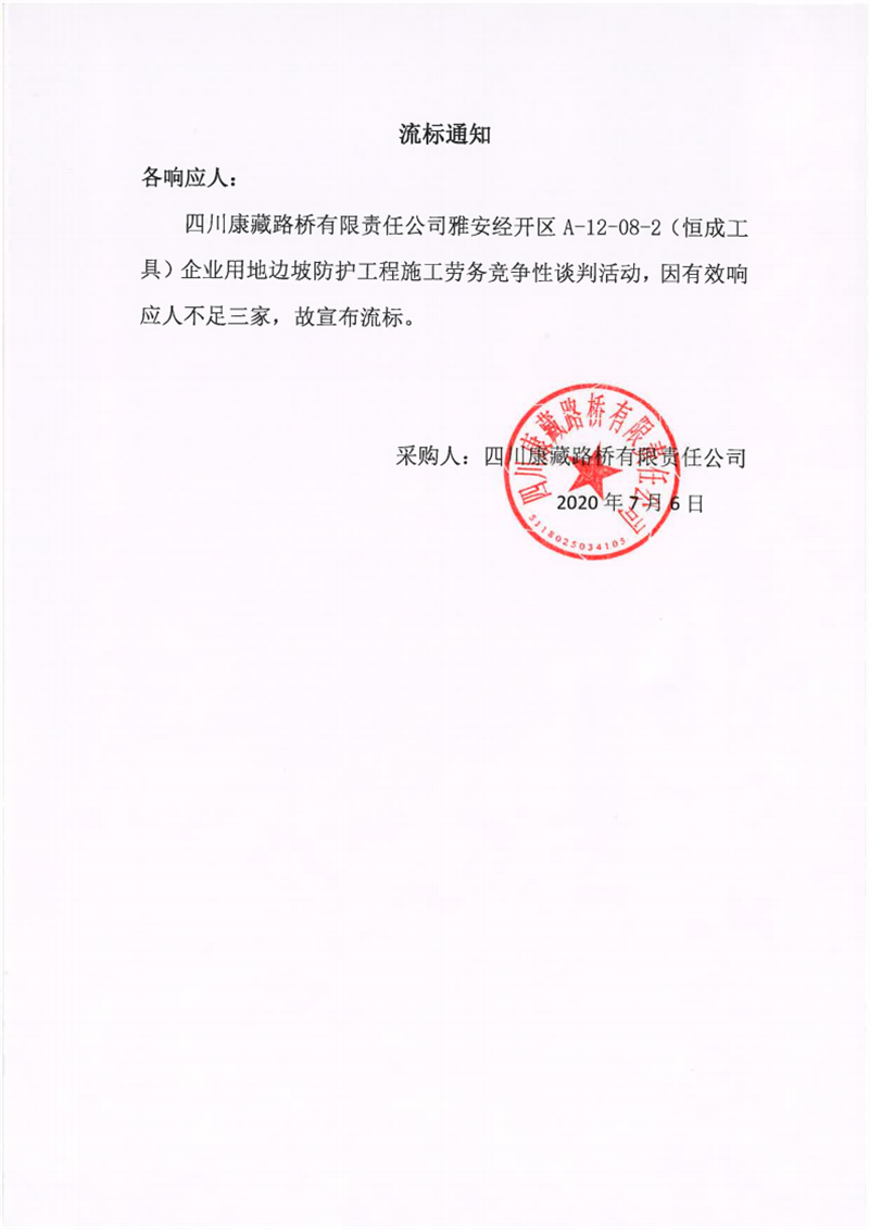四川康藏路桥有限责任公司雅安经开区A-12-08-2(恒成工具)企业用地边坡防护工程施工劳务流标通知