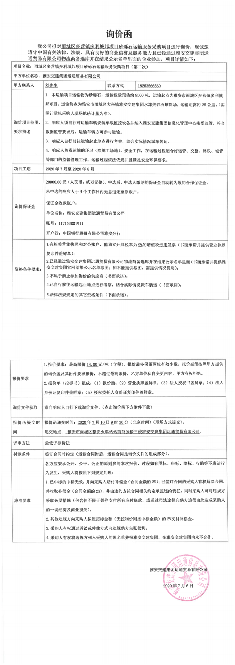 威廉希尔集团运通贸易有限公司雨城区多营镇多利城邦项目砂砾石运输服务采购项目(第二次)询价函