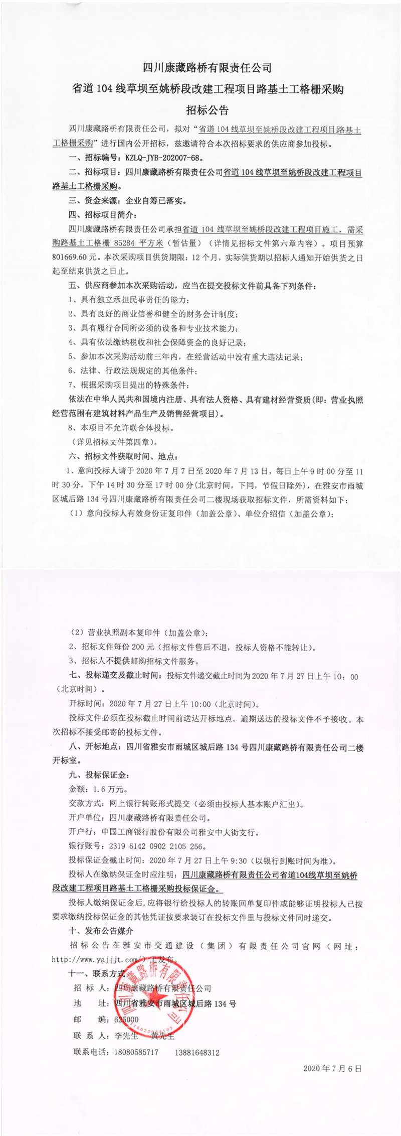 四川康藏路桥有限责任公司省道104线草坝至姚桥段改建工程项目路基土工格栅采购招标公告