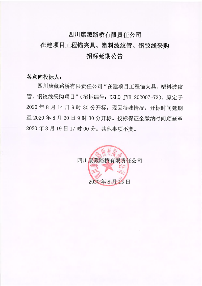 四川康藏路桥有限责任公司在建项目工程锚夹具、塑料波纹管、钢铰线采购招标延期公告