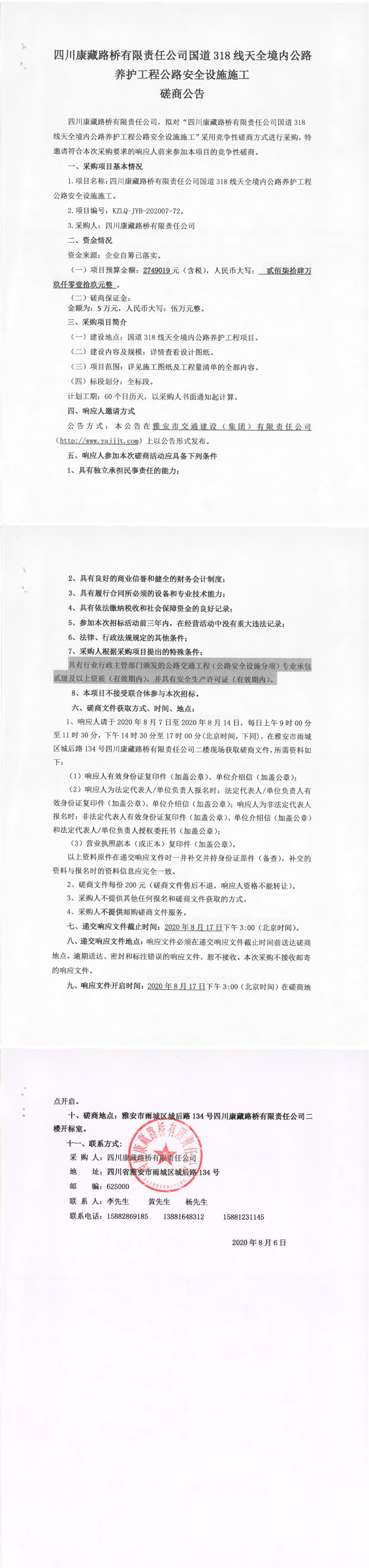 四川康藏路桥有限责任公司国道318线天全境内公路养护工程公路安全设施施工磋商公告