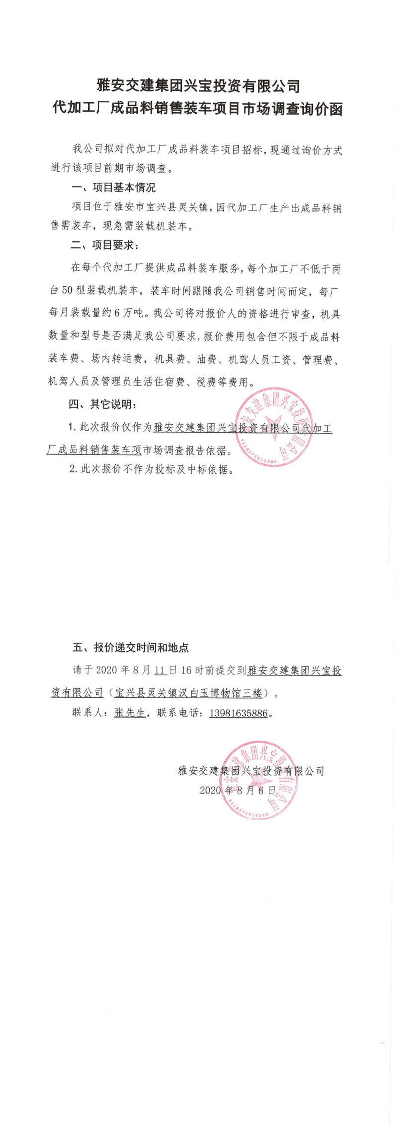 威廉希尔集团兴宝投资有限公司代加工成品料销售装车项目市场调查询价函