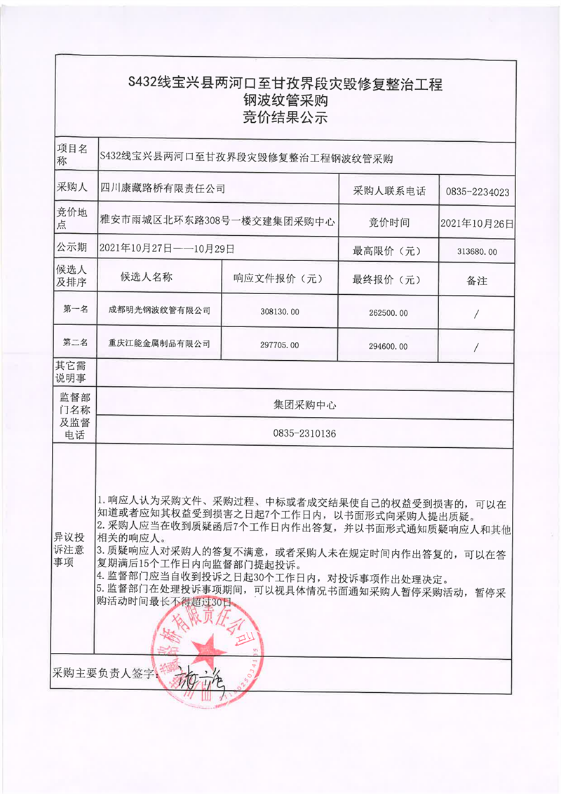 四川康藏路桥有限责任公司S432线宝兴县两河口至甘孜界段灾毁修复整治工程钢波纹管采购竞价结果公示
