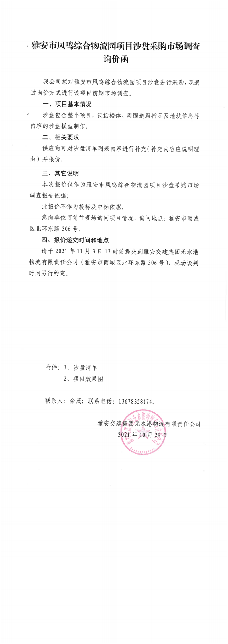 威廉希尔集团无水港物流有限责任公司雅安市凤鸣综合物流园项目沙盘采购市场调查询价函