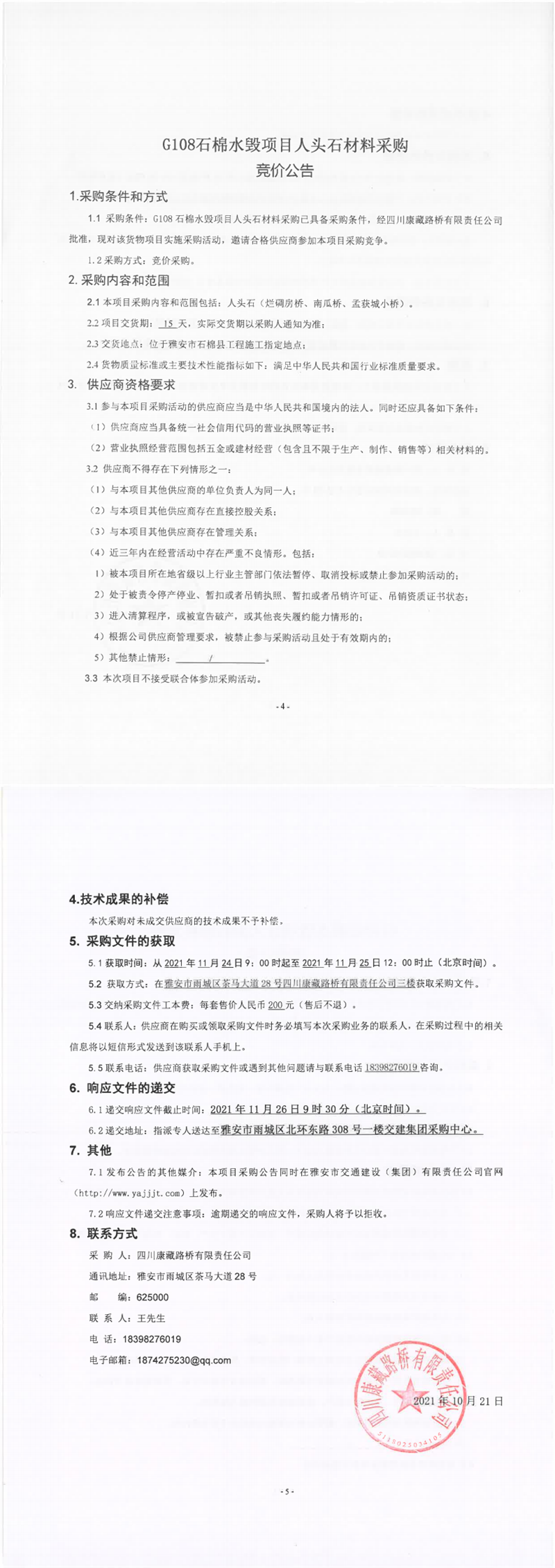 四川康藏路桥有限责任公司G108石棉水毁项目人头石材料采购竞价公告