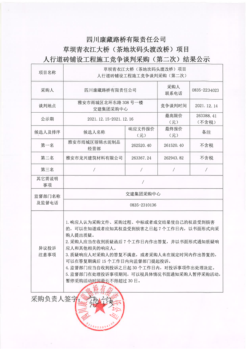 四川康藏路桥有限责任公司草坝青衣江大桥(茶地坎码头渡改桥)项目人行道砖铺设工程施工竞争谈判采购(第二次)结果公示