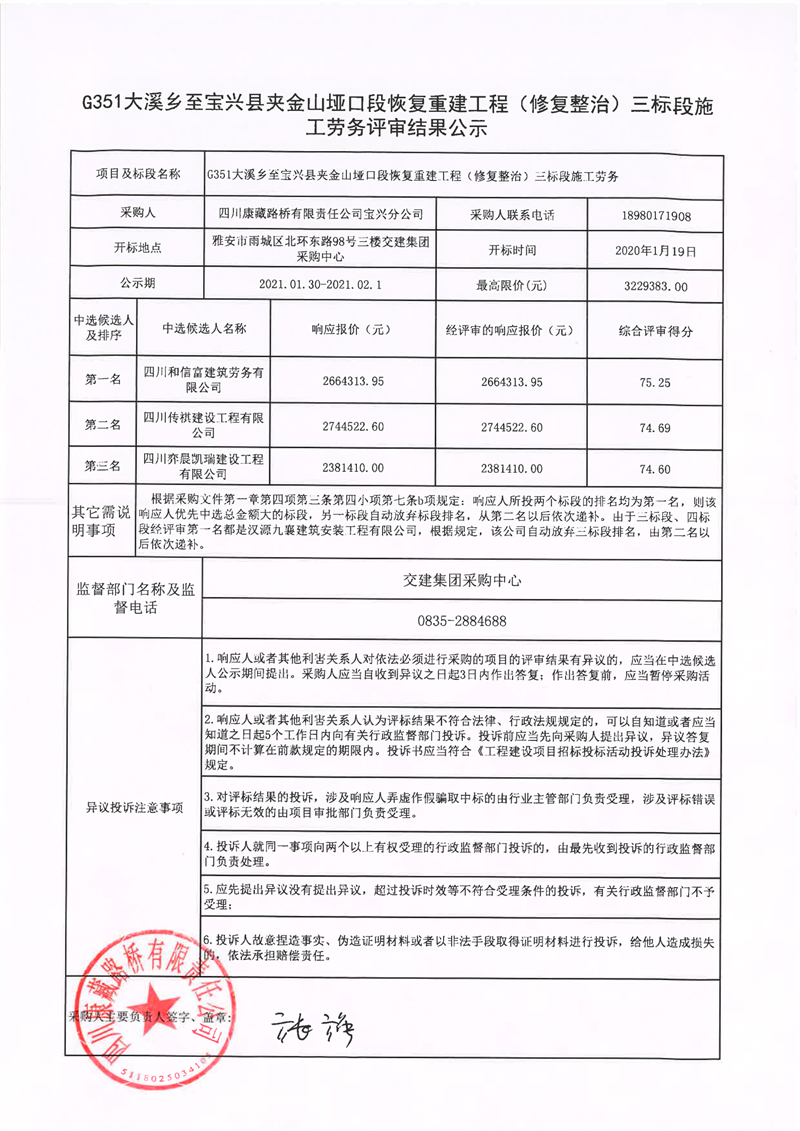 四川康藏路桥有限责任公司G351大溪乡至宝兴县夹金山垭口段恢复重建工程(修复整治)四标段施工劳务评审结果公示