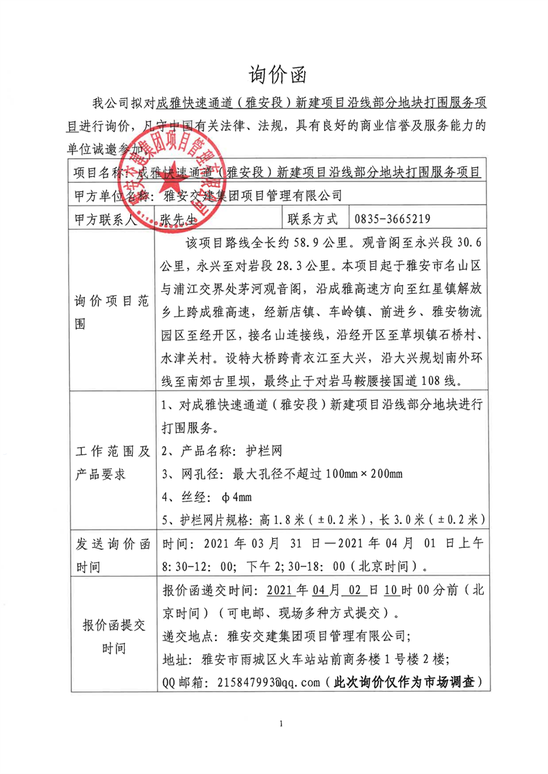 威廉希尔集团项目管理有限公司成雅快速通道(雅安段)新建项目沿线部分地块打围服务项目询价函