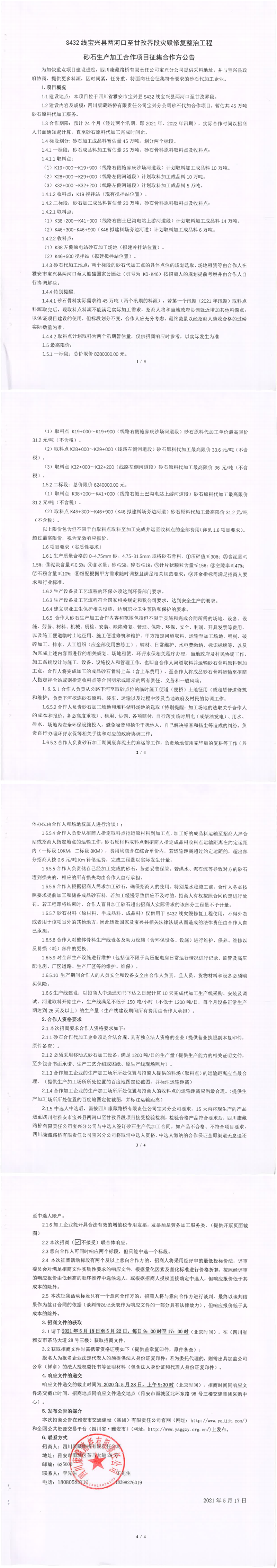 四川康藏路桥有限责任公司S432线宝兴县两河口至甘孜界段灾毁修复整治工程砂石生产加工合作项目征集合作方公告