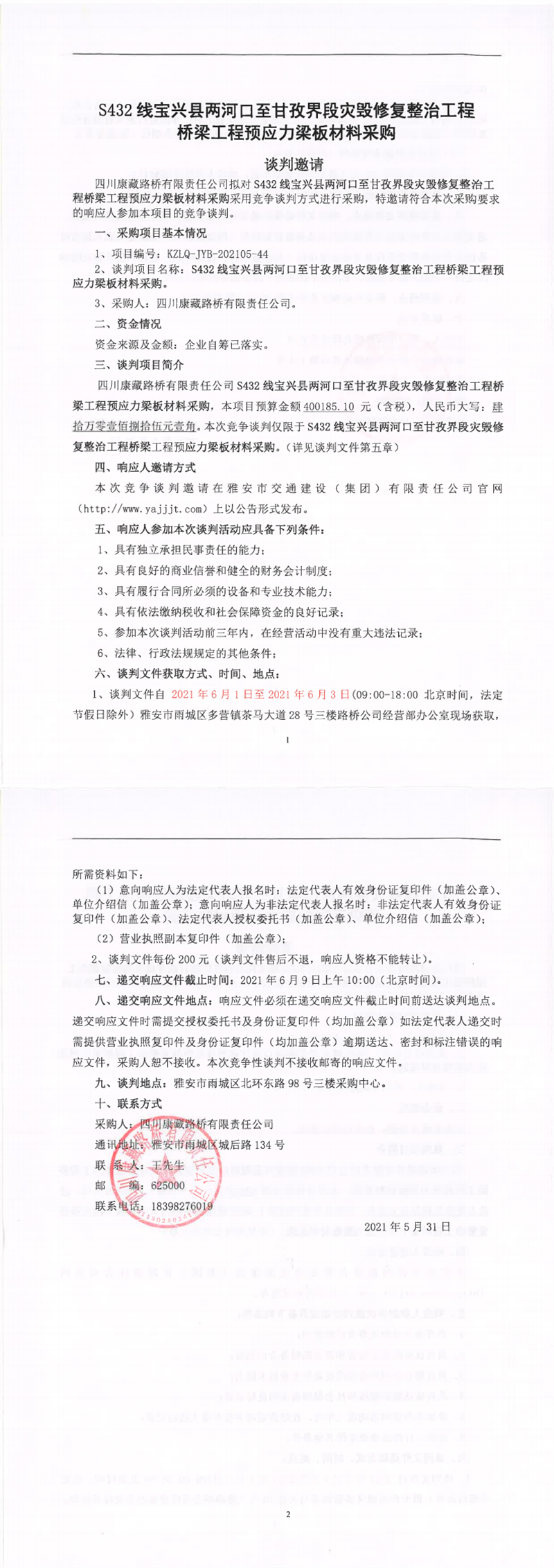 四川康藏路桥有限责任公司S432线宝兴县两河口至甘孜界段灾毁修复整治工程桥梁工程预应力梁板材料采购竞争谈判公告
