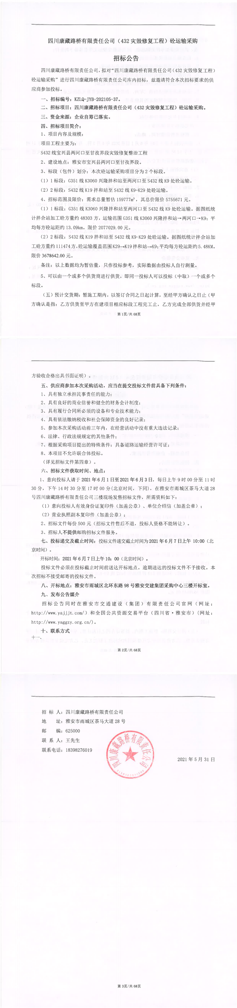 四川康藏路桥有限责任公司(432灾毁修复工程)砼运输采购招标公告