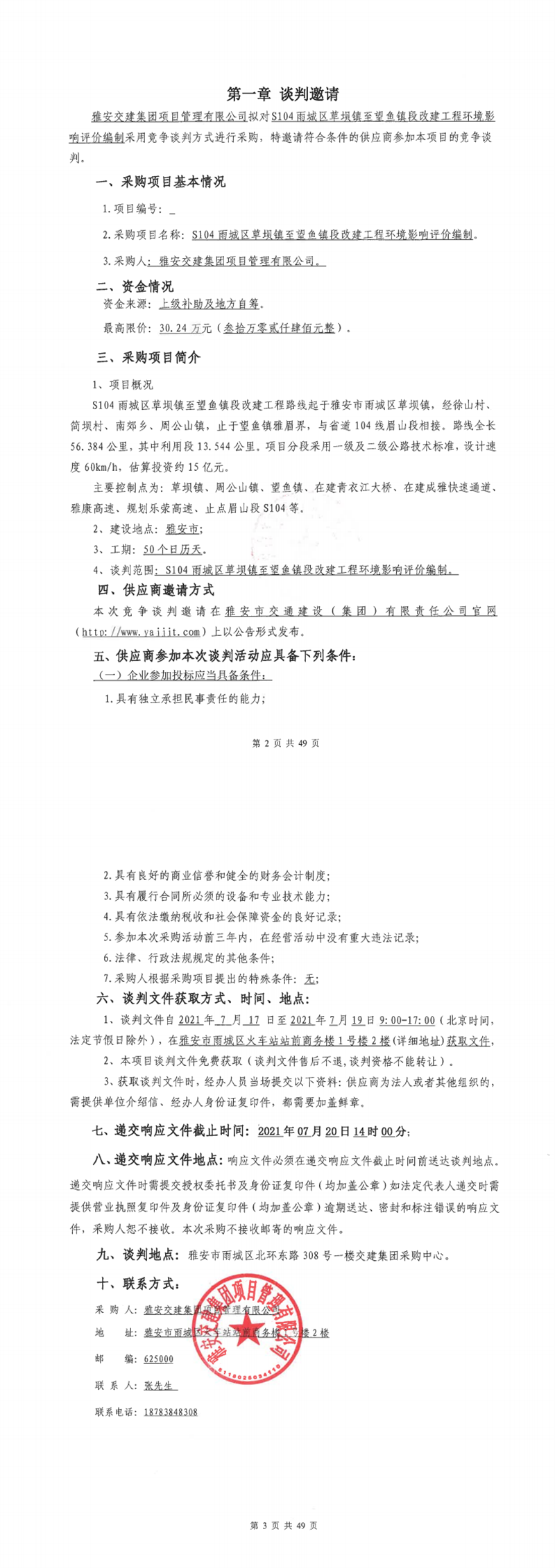 威廉希尔集团项目管理有限公司S104雨城区草坝镇至望鱼段改建工程环境影响评价编制竞争谈判公告