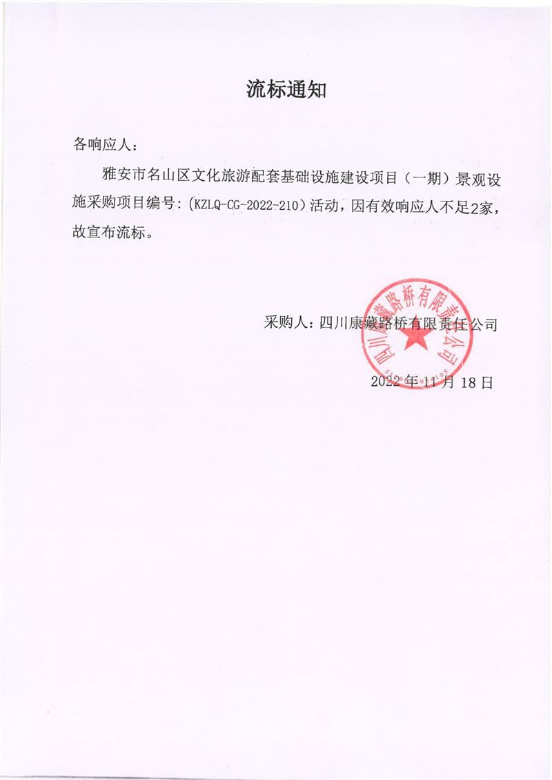 四川康藏路桥有限责任公司雅安市名山区文化旅游配套基础设施建设项目(一期)景观设施采购项目流标通知