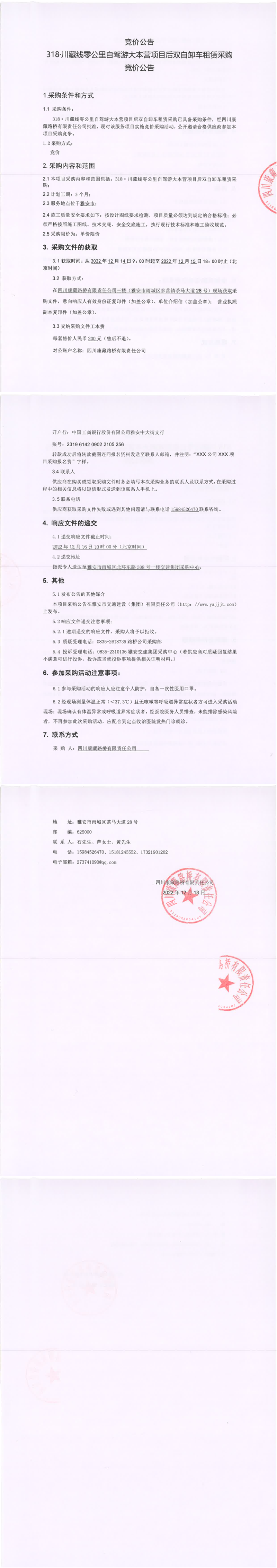 四川康藏路桥有限责任公司318.川藏线零公里自驾游大本营项目后双自卸车租赁采购竞价公告