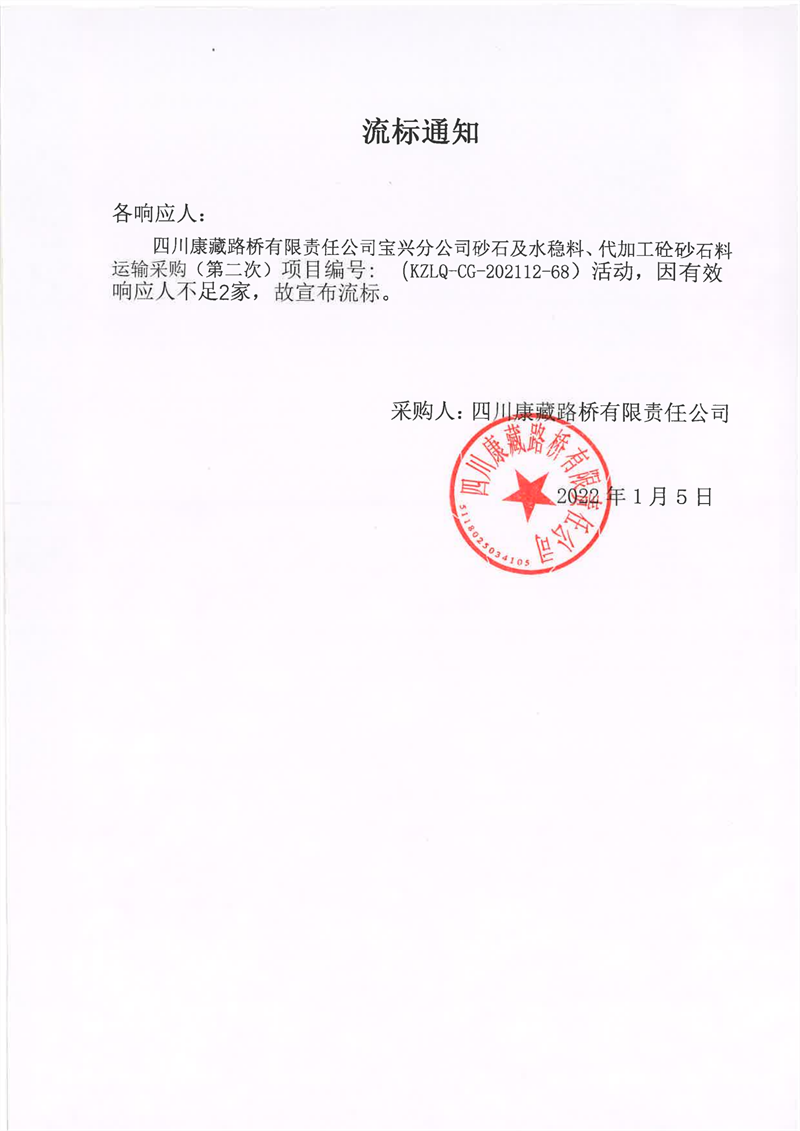 四川康藏路桥有限责任公司宝兴分公司砂石及水稳料、代加工砼砂石料运输采购(第二次)流标通知
