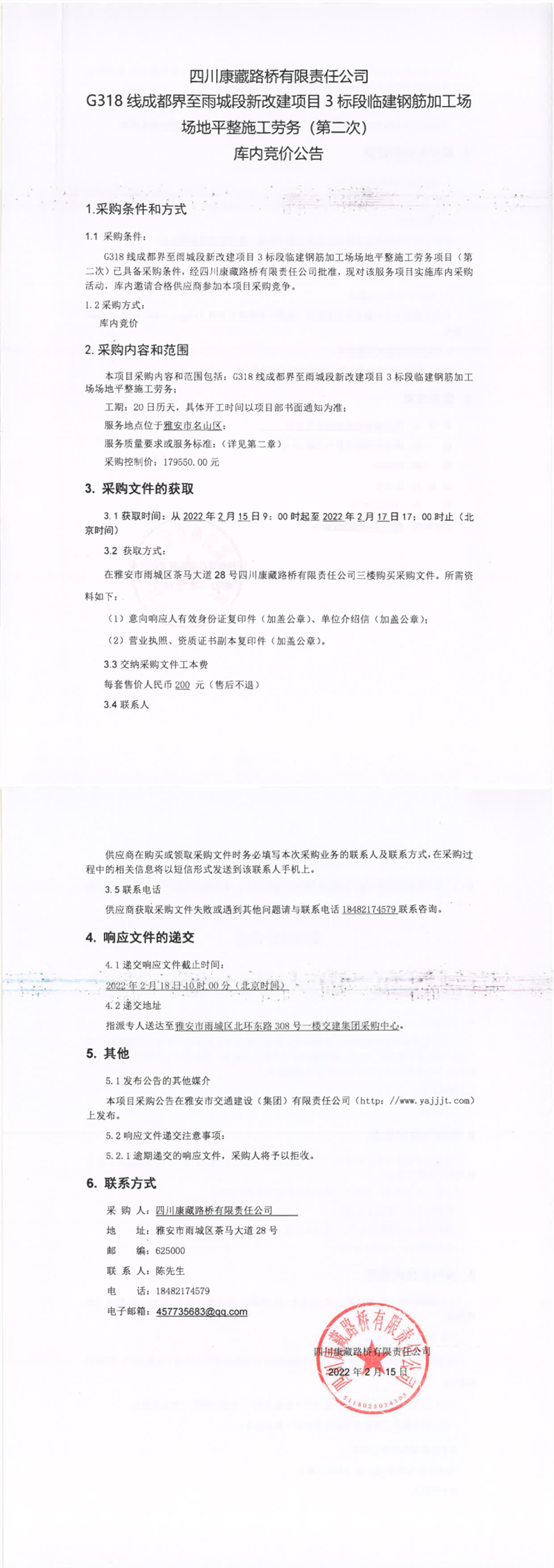 四川康藏路桥有限责任公司G318线成都界至雨城段新改建项目3标段临建钢筋加工场场地平整施工劳务(第二次)库内竞价公告