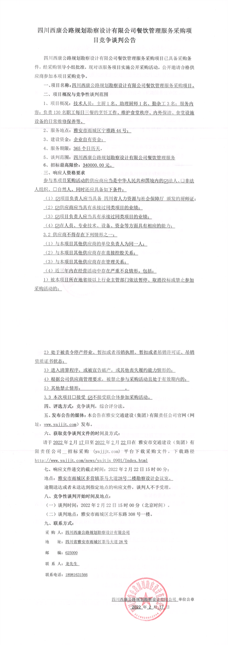 四川西康公路规划勘察设计有限公司餐饮管理服务采购项目竞争谈判公告