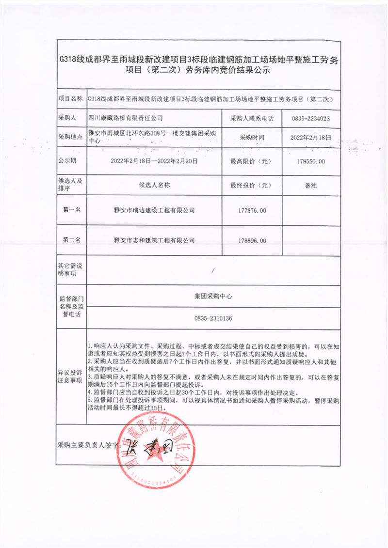 四川康藏路桥有限责任公司G318线成都界至雨城段新改建项目3标段临建钢筋加工场场地平整施工劳务(第二次)库内竞价结果公示