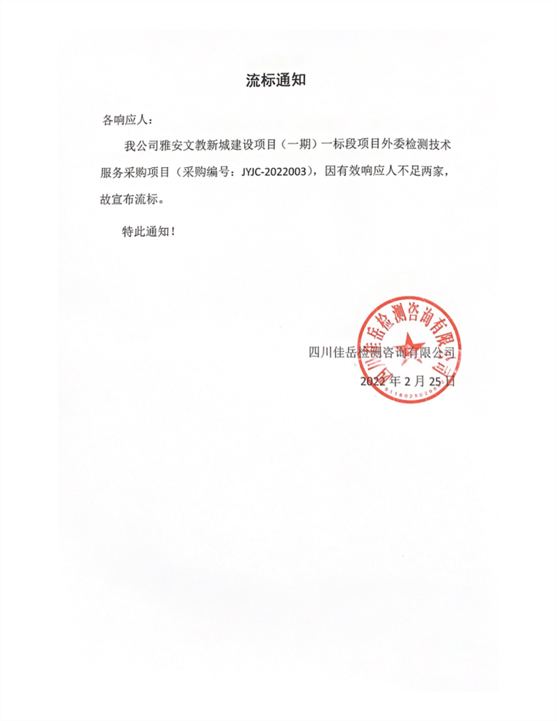 四川佳岳检测咨询有限公司雅安文教新城建设项目(一期)一标段项目外委检测技术服务采购项目流标通知
