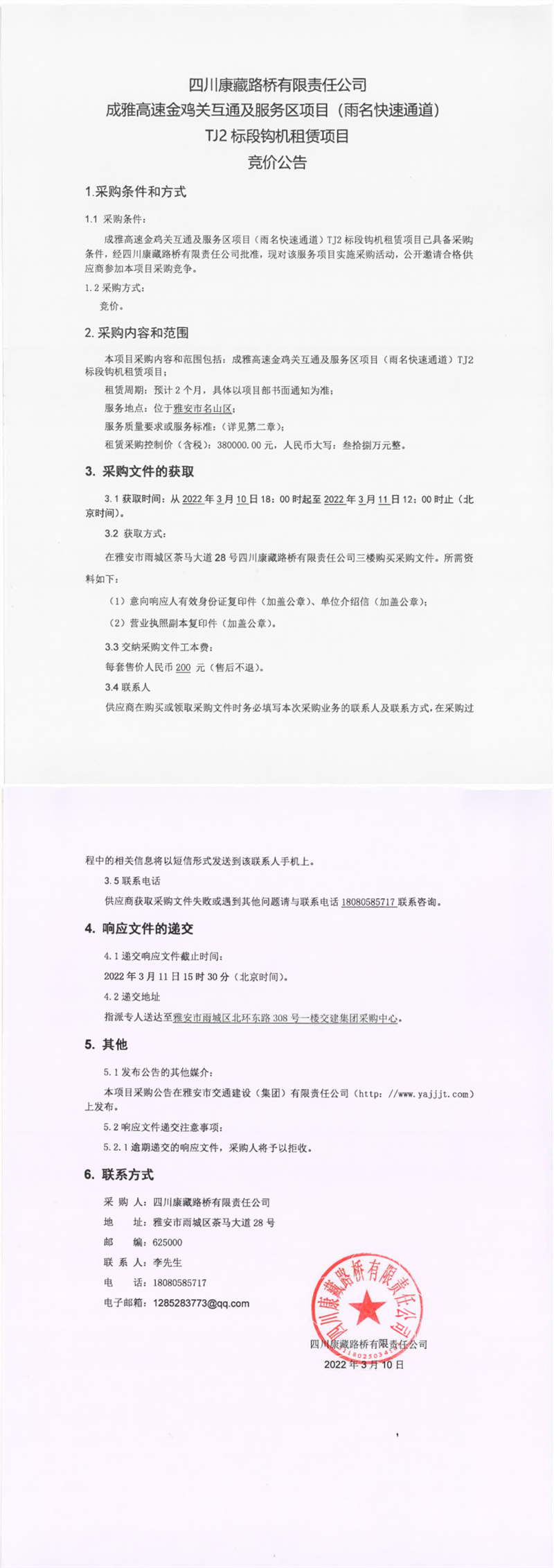 四川康藏路桥有限责任公司成雅高速金鸡关互通及服务区项目(雨名快速通道)TJ2标段钩机租赁项目竞价公告