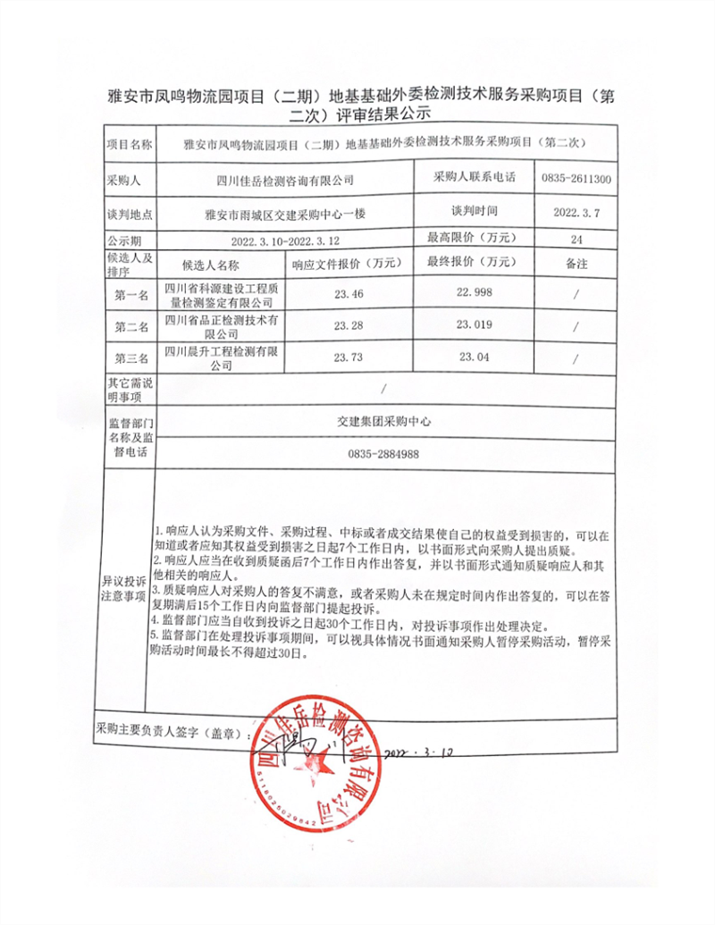 四川佳岳检测咨询有限公司雅安市凤鸣物流园项目(二期)地基基础外委检测技术服务采购项目(第二次)评审结果公示