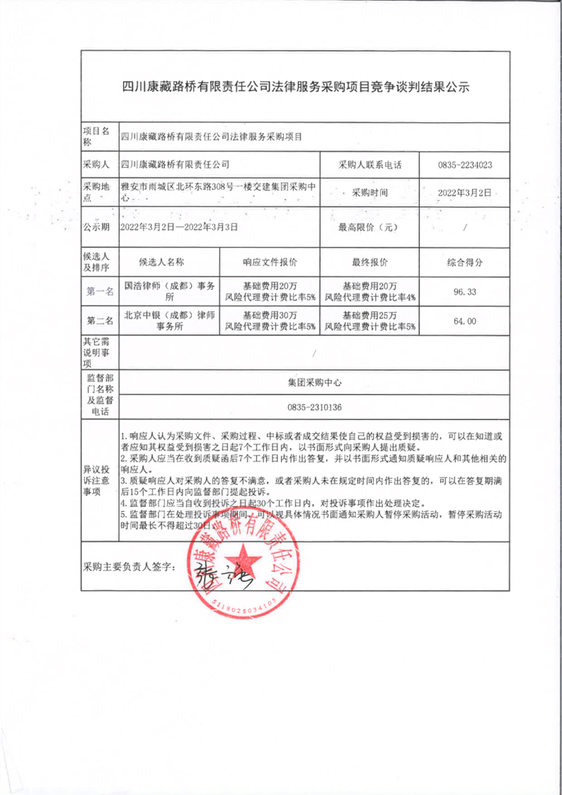 四川康藏路桥有限责任公司法律服务采购项目竞争谈判结果公示